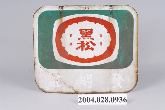本件吉利果與黑松雙面廣告鐵牌通身以鐵片製作,作雙面琺瑯彩色印刷,邊緣略帶褐色鏽痕,頂端帶有2個吊掛孔,呈長40.2公分,寬34.4公分,高1.8公分之橫式長方形廣告吊牌。雙面以白色為底色,上端邊緣皆印有紅色「31」數字,下段同樣印有紅字「莊明發」,應為雜貨店店名。鐵牌一面印有長方形淡藍色底框,中央以白色線條作上窄下寬之梯形框,上下框皆以3道曲線作波浪紋。框內印有「請喝吉利果」字樣。另一面為綠色底框,中央處疊加白色底框,中央處以白底紅框,內緣作菱花口,框內印有「註冊商標黑松」字樣。