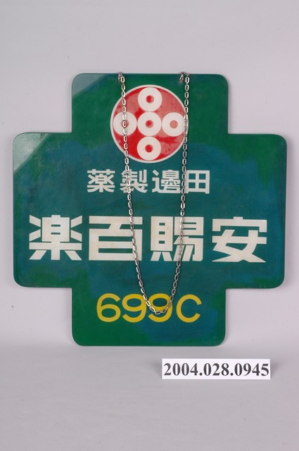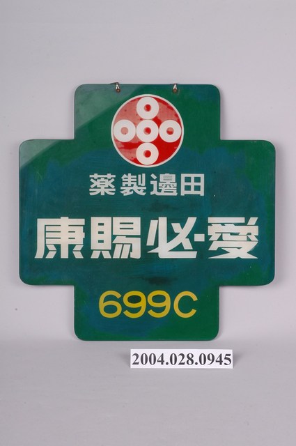 1.本物件為田邊製藥愛必賜康699C廣告牌。此為田邊製藥的藥品廣告,外型成十字型,兩面有不同藥品之名稱。底色為藍綠色,由上至下分別為五個白色圓圈的商標、白色字體田邊製藥、白色字體愛必賜康和黃色字字體699C。另一面由上至下則分別為五個白色圓圈的商標、白色字體田邊製藥、白色字體安賜百樂和黃色字字體699C。