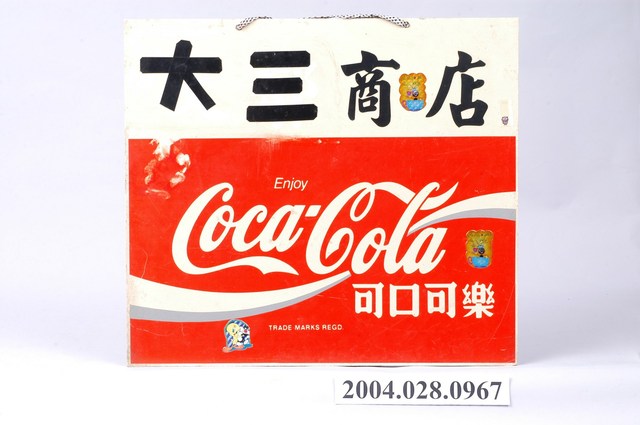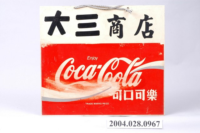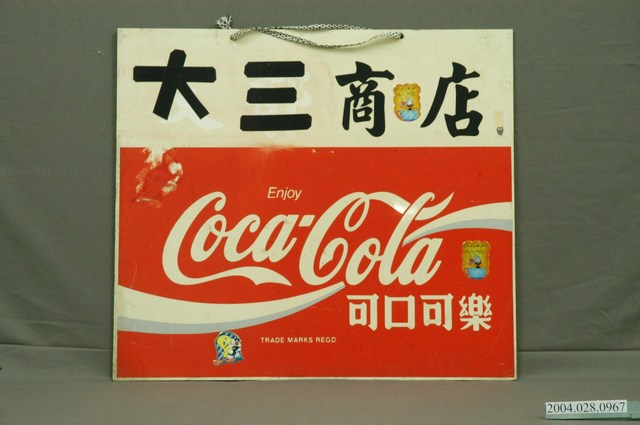1.本件可口可樂壓克力雙面廣告牌通身以白色壓克力板製作,作雙面彩色印刷,雙面帶有磨損與顏料溶暈痕跡,其中一面貼有卡通貼紙,頂端帶有2個吊掛孔,呈長45.1公分,寬40.1公分,高1.2公分之橫式長方形廣告吊牌。廣告牌雙面皆作相同版面設計,下端3分之2處以橫式可口可樂商標裝飾,為紅底白字,中段處以書寫體「Coca Cola」帶有流線型線條裝飾,上方印有「Enjoy」,右下方為「可口可樂」字樣。廣告上端為白底,貼印有「大三商店」字樣,其商店字樣為原始印刷,大三字樣則以黑色絕緣膠帶剪貼組合而成。2.本件雙面廣告牌主要掛置於雜貨店等商品販售處,具有廣告宣傳效果,掛置時多作凸出於壁面的吊掛看板,使其雙面皆具廣告效果。