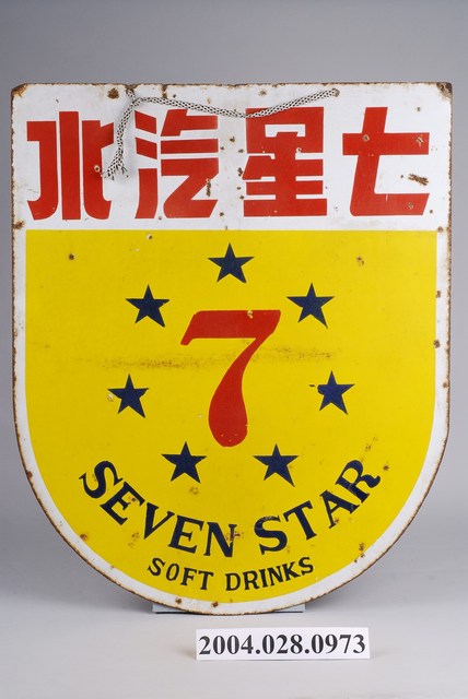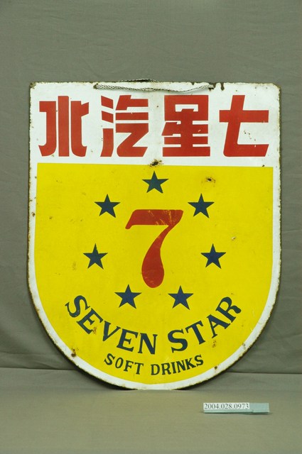 1.本件七星汽水雙面廣告鐵牌通身以鐵片製作,作琺瑯彩色印刷,其邊緣帶有褐色生鏽痕跡,頂端帶有2個吊掛孔,呈長48.6公分,寬59.5公分之盾形廣告吊牌。廣告牌雙面皆作相同版面設計,上端以白底印上橫書「七星汽水」紅字,下端3分之2處,邊緣作白框,黃色為底色,中央印有紅色數字「7」,並以7枚藍色五角星環繞周圍,下端作2行曲線文字各為「SEVEN STAR」與「SOFT DRINKS」。2.本件雙面廣告牌主要掛置於雜貨店等商品販售處,具有廣告宣傳效果,掛置時多作凸出於壁面的吊掛看板,使其雙面皆具廣告效果。七星汽水主要由富泉食品公司製作,為1954年創立。