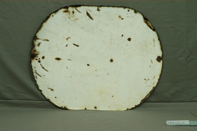 本物件為強力殺蟲劑鐵招牌,材質為鐵質,為橢圓形鐵招牌,正面為白底,上半部分為1名身穿深藍色和服之半身男子,右手持有1瓶殺蟲劑,其下方有「強力殺蟲劑」白色字樣,正面已有鏽蝕及髒汙,背面無圖案字樣。