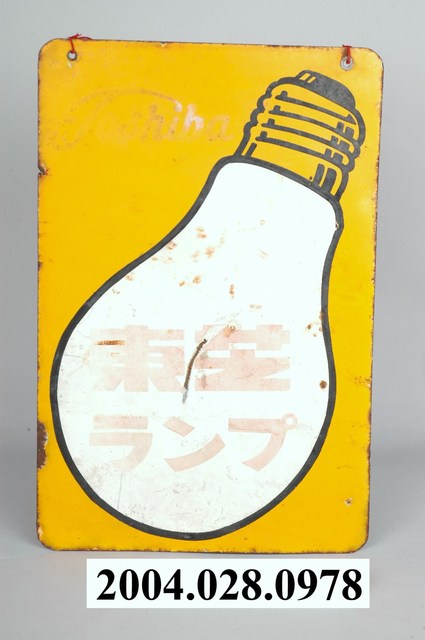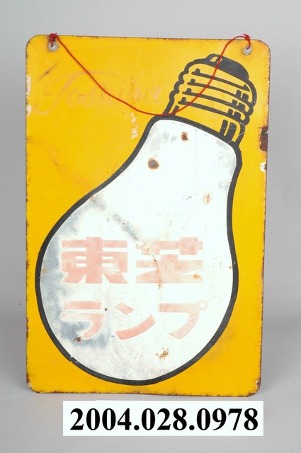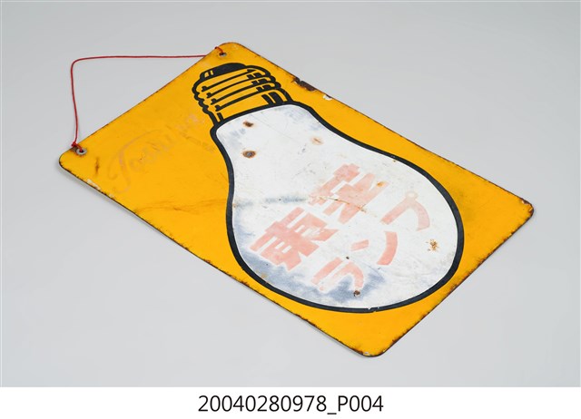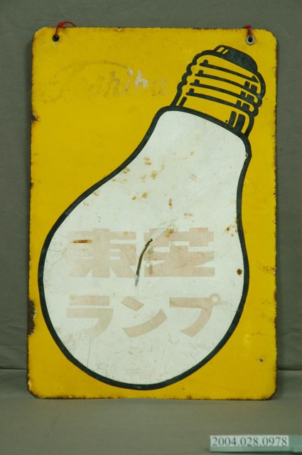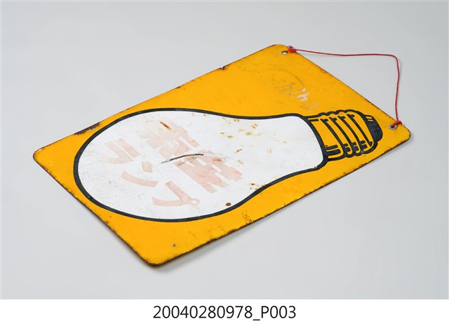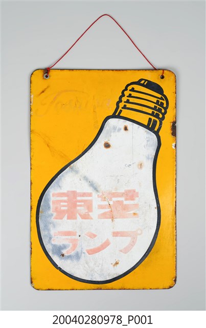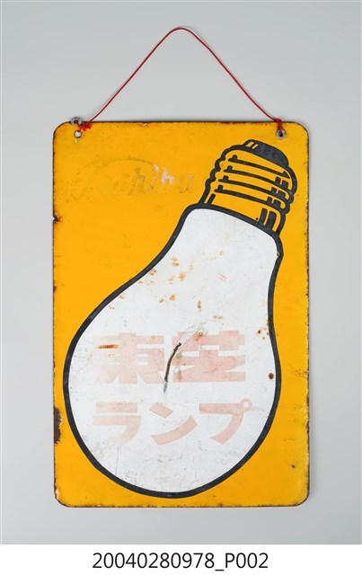 1.本物件為東芝燈泡鐵招牌,材質為鐵質,為長方形鐵招牌,正面為黃底,有燈泡圖案,燈泡之玻璃面為白色,上有褪色之「東芝ランプ」字樣,正面稍有鏽蝕及髒汙,背面為相同圖案與字樣,物件上方有2個孔洞,供繩線穿過,供吊掛使用。