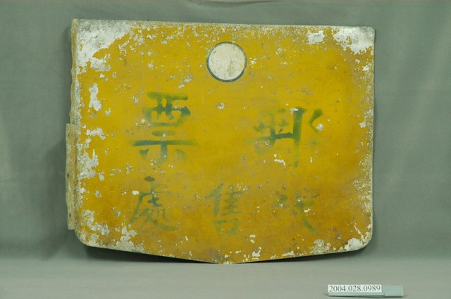 本物件為郵票代售處鐵招牌,物件為鐵製招牌,招牌的底色為黃色,中央印有郵局標誌,綠色文字由右至左為「郵票 代售處」,整體外觀有顏色斑駁的痕跡。招牌背面與正面的說明文字與圖案內容一致,但是印刷不清楚。