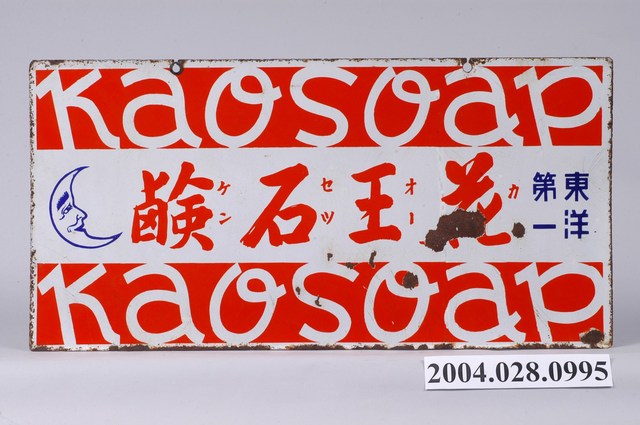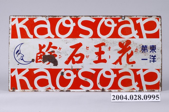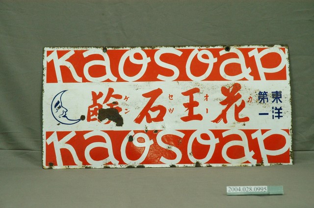 本文物為花王石鹼廣告鐵牌,最上方有兩個鑽孔,用於固定鐵牌。鐵牌上下方標示紅底白字醒目的花王英文字樣「Kao Soap」;中間顯示白底紅字「花王石鹼」,石鹼是日本漢字,為肥皂的意思;右邊顯示藍字「東洋第一」;左邊顯示花王商標圖案。花王石鹼是花王在1890年代推出的第一塊肥皂商品,鐵牌上的花王商標是1925至1943年的造型設計,判斷此鐵牌為日治時期商家宣傳廣告之用。