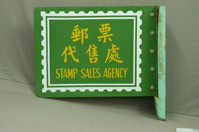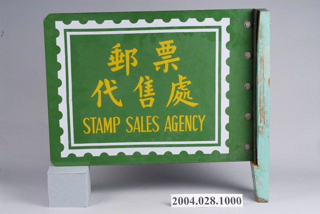 本物件為郵票代售處鐵招牌,物件為鐵製招牌,招牌的底色為綠色,有類似郵票形狀的白色邊框,邊框內以黃色字體寫有「郵票代售處 STAMP SALES AGENCY」,該郵票代售處鐵牌釘在淺綠色木頭上。招牌背面與正面的說明文字與圖案內容一致。