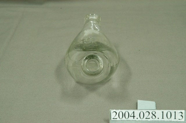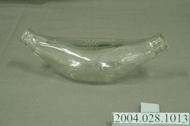1.此件玻璃奶瓶由透明玻璃製成,整體似香蕉的形狀,長約19.2公分,寬約7.2公分,高約6.3公分,玻璃內有些許氣泡。瓶口位於兩端,瓶蓋已丟失,應是套上橡膠套供嬰兒吸吮。瓶身自瓶口溜肩至瓶身中段,中段成最寬部分,底部為平面,用於放置。瓶身中段壓有圓形標誌,側邊則壓有刻度。