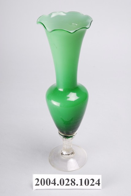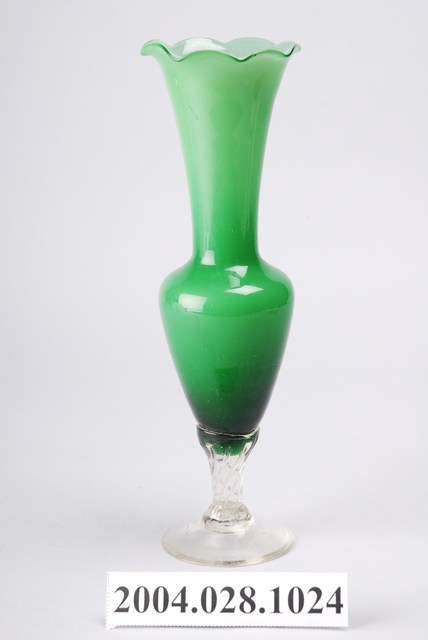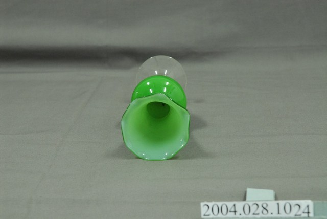 1.本件綠白雙色玻璃花瓶,整體以玻璃製作而成。器身採套料工法以手工吹製呈現外層綠色,內層白色之雙色素面花瓶,口沿如半開百合花呈外侈花口狀,頸部細長呈上寬下窄之束頸狀,下接豐肩,腹部作上寬下窄之倒圓錐形,底部續接透明玻璃製作的高足外僘圓盤面底足。2.臺灣玻璃工業主要發展於日治時期,由於新竹地區產有天然氣以及製作玻璃所需的矽砂,在1929年設立高級玻璃株式會社,民間也於新竹當地設立小規模工廠,大量生產日常所需之玻璃製品,新竹成為臺灣玻璃製造的重要產地。
