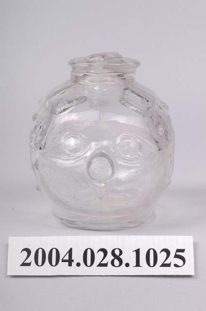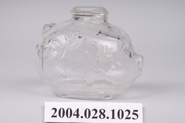 本物件為玻璃製透明小豬形狀的存錢筒,頂端有一孔蓋,豬身兩側有浮雕花朵圖案作為綴飾。