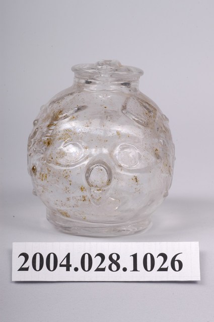 本物件為玻璃製透明小豬形狀的存錢筒,頂端有一孔蓋,為投幣之處,豬身兩側有浮雕花朵圖案作為綴飾,存錢筒身有褐色斑駁污漬。