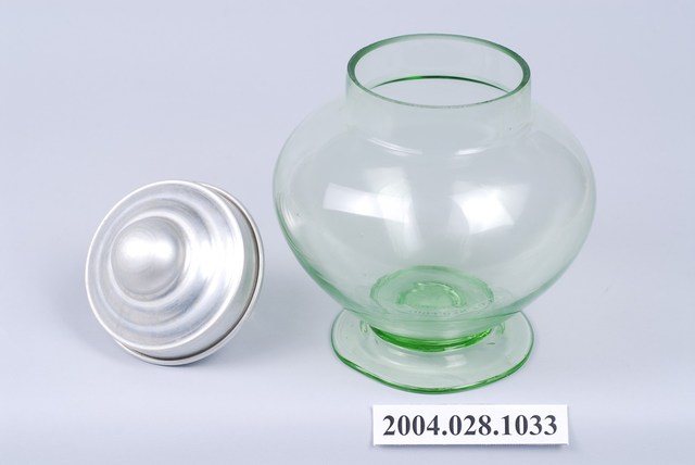 2.玻璃糖果罐是日治至戰後時期常見的民生器具,不管是販賣部或是一般民眾家中均有玻璃糖果罐的蹤跡。玻璃糖果罐通常均有頸短、大口的特色,利於抓取內容物,並採用合金或薄金屬製成的蓋,採直接蓋上密合的方式,方便人們取用。因相較於傳統陶、瓷容器更為輕巧美觀,時常被用於存放餅乾、糖果或醃漬物。