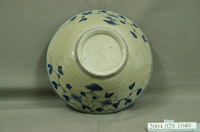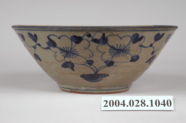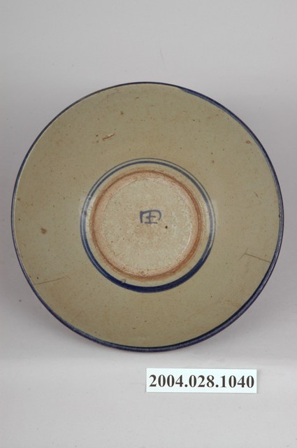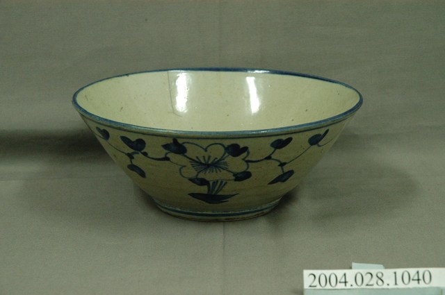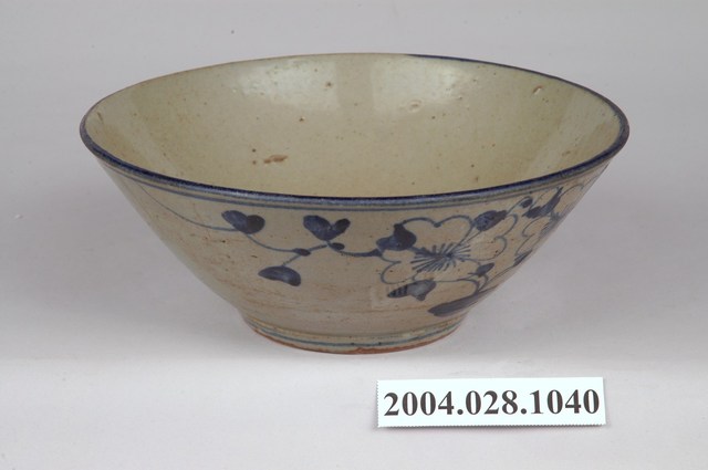 1.手繪白瓷青花雞紋碗圓唇,微外侈,斜直壁下斂至圈足,圈足露胎,胎色淺且略帶黃,胎質較細緻。全器滿施白釉,釉色白中帶黃,呈色較濁。碗心有澀圈,是因堆疊入窯燒製後的脫釉痕跡;器表有許多氣孔,亦是窯燒溫度過高而致。口沿以鈷藍釉施作一圈線紋,主要紋飾皆以鈷藍彩繪製,且集中於碗外壁,青花發色濃重。外壁口沿下方繪一圈弦紋,圈足處繪雙圈弦紋,外壁繪兩組相同的花卉紋樣。紋飾為兩朵連枝的牽牛花,花朵、枝葉飽滿,以線條變化增添花卉的生命力,用筆簡單、圖案化。碗心繪有雙圈紋,圈文之中書一「田」字。