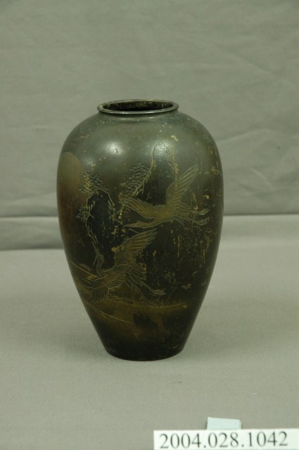 1.本文物為陶瓶,刻有雙鶴、山水與樹,瓶身為雙色燒製,後有落款「國語普及功勞者 臺中州」。2.在日治時期後期,日本政府施行皇民化運動,鼓勵國語(日語),因此於重要的各項會議、集會,都會辦理國語普及功勞者的表揚,以宣傳皇民精神。