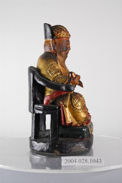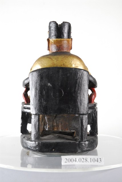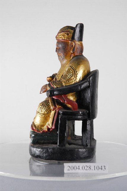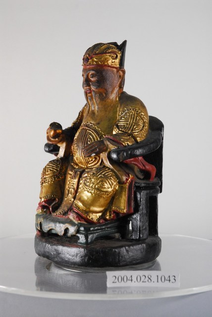 土地公又稱福德正神,部分地區也稱為伯公、后土、社神、土地神等。土地公傳說眾多,一般人生前行善,死後亦有被封為土地公者。土地公不僅掌一境之地,也被視為是文財神。本件土地公頭戴冠帽,身著金色員外服,右手持金元寶,端坐圈椅,面紅豐髯。圈椅塗以黑漆,漆色仍相當鮮豔。