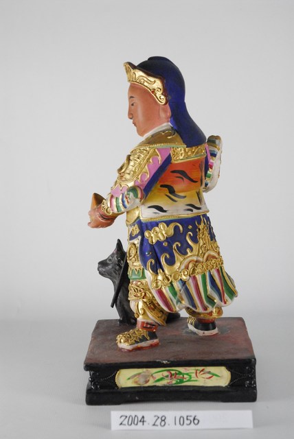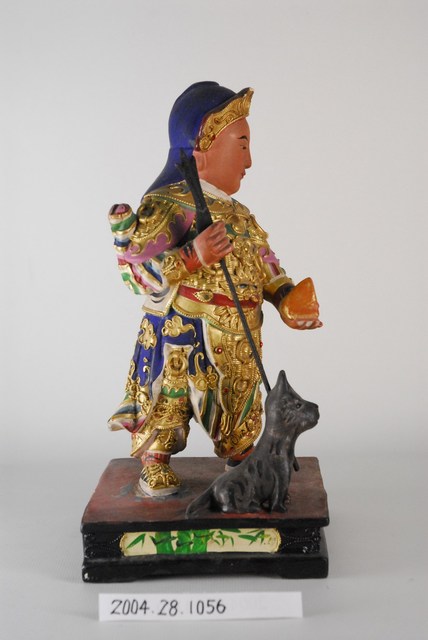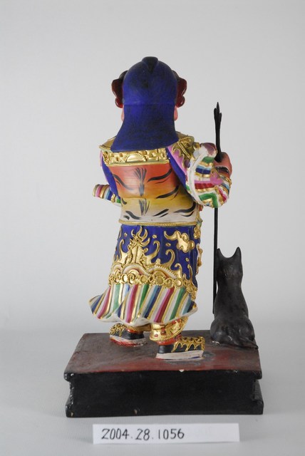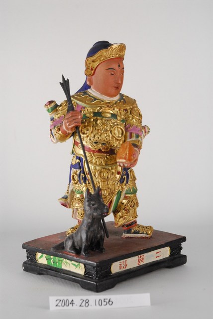 本件為木雕二郎神神像,站姿方形底座,戴帽粉臉繪第三隻眼專注貌,身穿武將服裝,左手捧一物於腰際,右手持三叉尖槍。右側有一隻哮天犬。神像安金上彩裝飾繁複。底座正面寫二郎神。二郎神的形像在明代章回小說《西遊記》、《封神演義》中,形成有血有肉的靈魂角色。小說中所述之楊二郎、楊戩,即具備濃厚的武將性格,好戰、善鬥且具開創性。