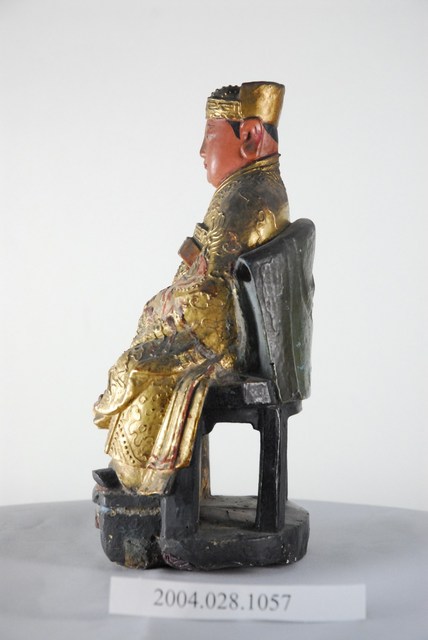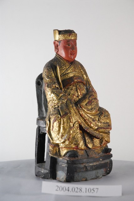一般稱為灶君、灶神,為昔日天子五祀(戶、灶、中霤、門、道路)之一,司命主知人之生死,輔天行化、誅惡護善,與灶神職權不同,司命與灶神合一,首見於孔安國禮記注:「灶神以時錄人功過,上白於天,當祀之,以祈福祥。」灶神本為器物崇拜,無分男女,後漢之後有種種有關灶神的姓氏生平傳說,如張子郭、張定福等。本件灶神頭戴官帽,身著龍紋朝服,雙手合抱奏板,端座圈椅上,貌俊秀年輕。圈椅漆以黑漆,扶手已斷裂脫落。