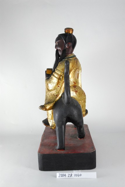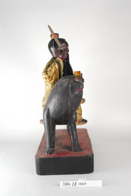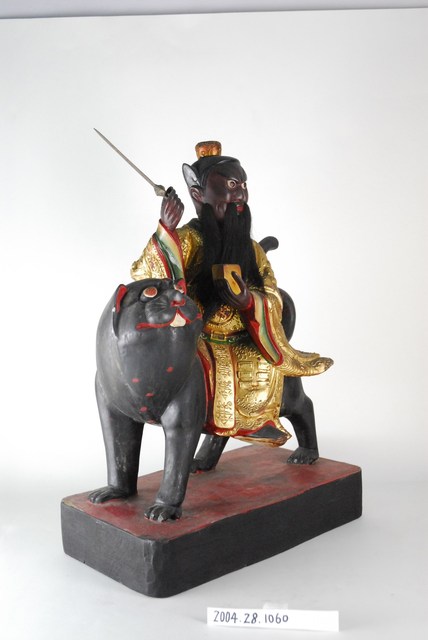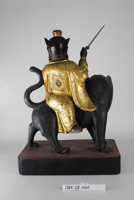 本件為木雕張天師神像,跨坐姿勢騎黑虎,張天師烏臉頭戴金冠雙眼圓睜,虯髯及胸。左手捧印於胸腹部,右手持寶劍,造型類似高功道長之裝束。神像安金上彩。背部有一個圓形入神孔,孔內有填塞物。張天師之坐騎黑虎,站姿轉頭側視,露牙戇厚貌。張天師即張道陵(34-165),東漢沛國豐縣人,創建五斗米道,亦稱天師道,金元以後中國北方出現道教另一大派全真道,天師道改稱為「正一道」,盛行於中國南方。清代臺灣的張天師信仰,隨著火居道士的醮儀活動傳入。