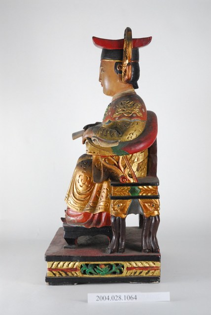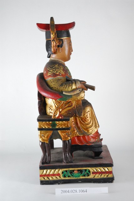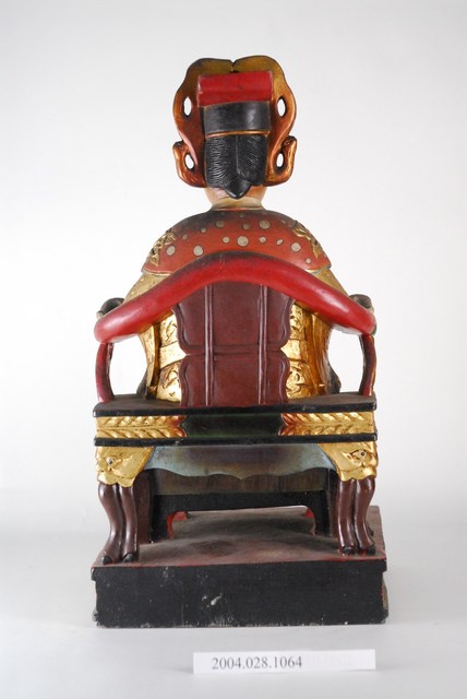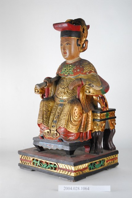 本件為木雕媽祖神像,頭戴冕冠,頭冠兩側有飄帶,頭後髮型為三片式(媽祖頭),臉型略圓福泰貌,粉面、雙眼微張、小嘴。媽祖座於龍頭扶手圈椅,雙肘靠扶手,右手持一物。腰際間有玉板革帶,腹部中央為正面蟒紋,衣袍下露出弓鞋。底座三面雕刻彩繪花草紋。閩南媽祖信仰隨漢人遷徙入臺,成為臺灣人最虔信的神明之一,聖誕日前後形成「三月瘋媽祖」的宗教現象。