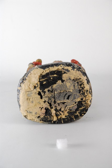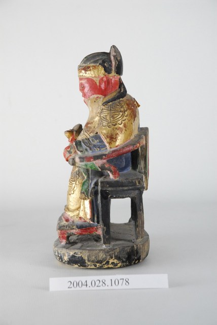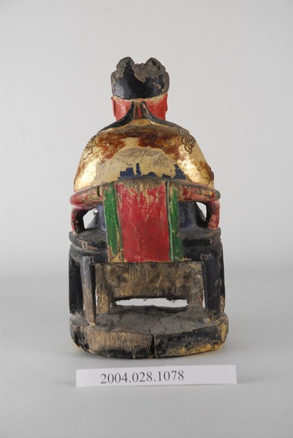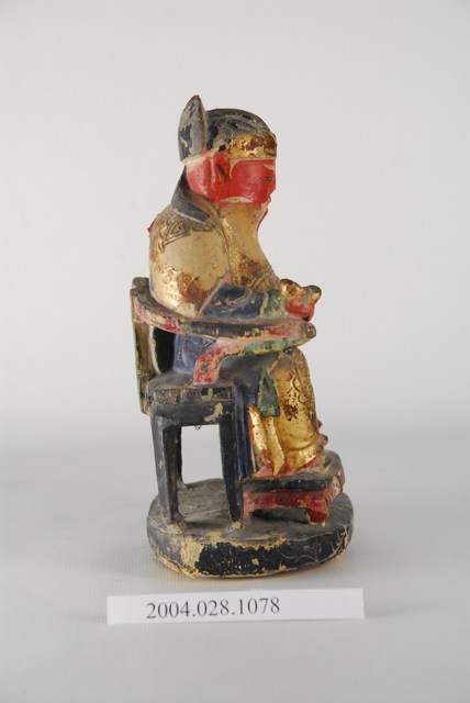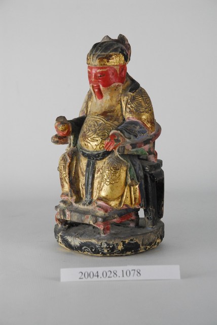 土地公又稱福德正神,部分地區也稱為伯公、后土、社神、土地神等。土地公傳說眾多,一般人生前行善,死後亦有被封為土地公者。土地公不僅掌一境之地,也被視為是文財神。本件土地公頭戴冠帽,身著畫有鶴鳥補子之朝服,粉臉豐髯,右手持金元寶,端坐圈椅上。神像後面從上到下都略有脫漆,底座已有較大的裂紋。