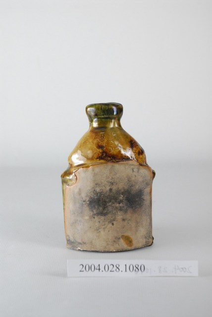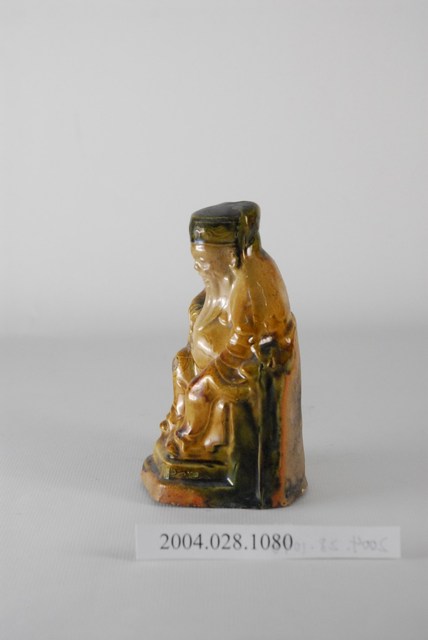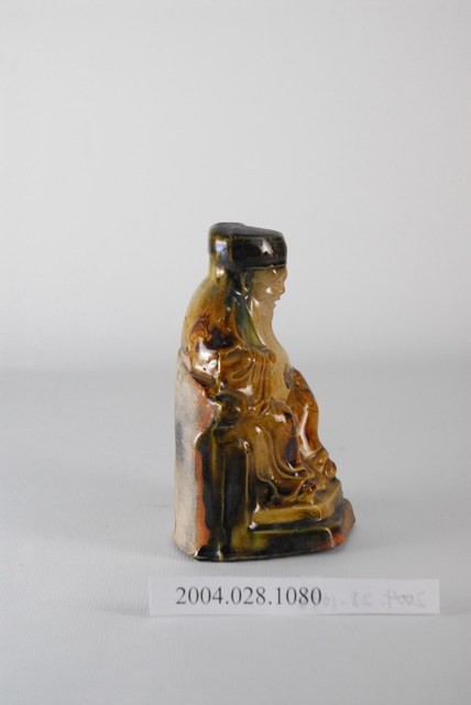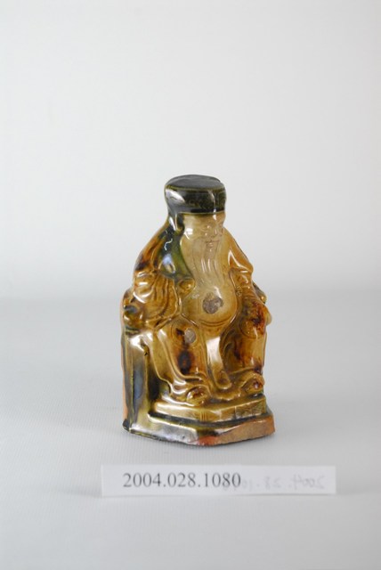 土地公又稱福德正神,部分地區也稱為伯公、后土、社神、土地神等。土地公傳說眾多,一般人生前行善,死後亦有被封為土地公者。土地公不僅掌一境之地,也被視為是文財神。本件為陶瓷土地公,土地公頭戴員外帽,身穿員外衣,右手持金元寶,端坐圈椅上。其製作乃採釉下彩方式燒製,主要以土黃色為主色調,帽子部分則採用黑色,右肩應是上釉粗糙,導致呈現略帶黑色的色彩。此型態土地公應該非常常見,故被採用為燒製樣式。