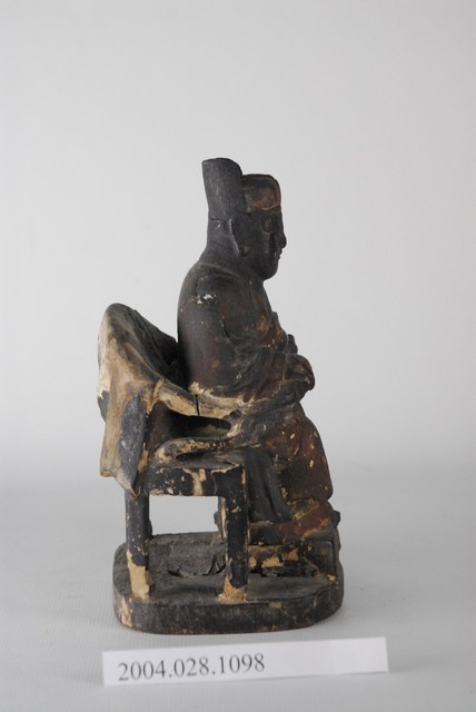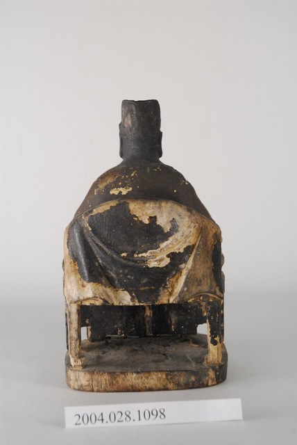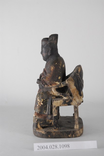 司命真君,一般稱為灶君、灶神,為昔日天子五祀(戶、灶、中霤、門、道路)之一,司命主知人之生死,輔天行化、誅惡護善,與灶神職權不同,司命與灶神合一,首見於孔安國禮記注:「灶神以時錄人功過,上白於天,當祀之,以祈福祥。」灶神本為器物崇拜,無分男女,後漢之後有種種有關灶神的姓氏生平傳說,如張子郭、張定福等。本件灶神頭戴冠貌,身著華服,端坐圈椅上,容貌較為年輕。圈椅、腳踏、底座結為一體,漆層略有脫落,圈椅後面較為嚴重。