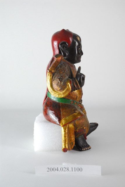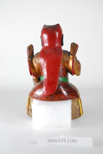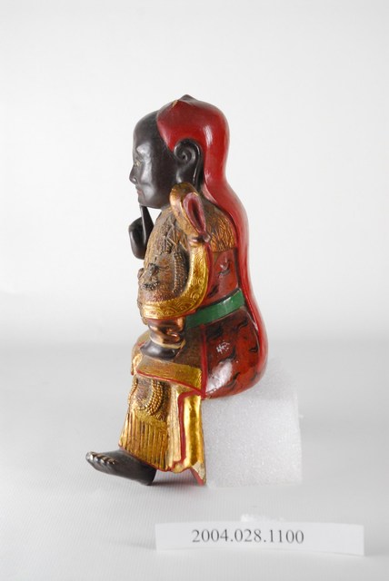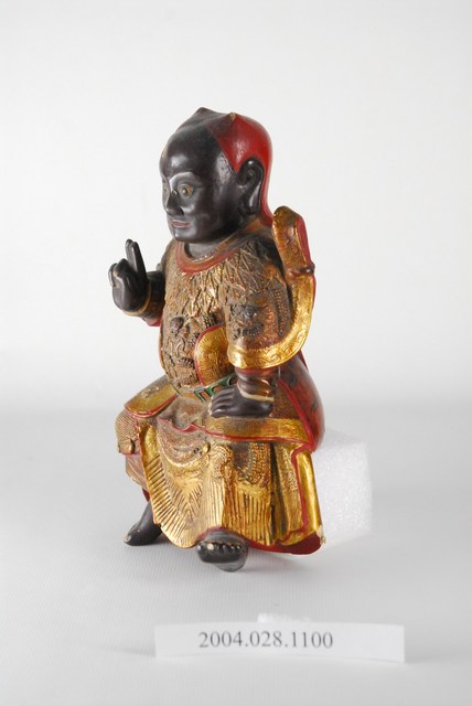 神農大帝是上古三皇之一,又稱先帝、五穀先帝、藥王等。相傳神農教民農耕,被尊為五穀之神,農業守護神。又嚐百草,故為藥王。神農形象特別,頭角崢嶸,坦胸露背,腰圍樹葉裙,赤手跣足,手持稻穗之原始型態。神像有白、黑、紅三種面色,以表達神農教民耕作、嚐百草、紅火燒林的事蹟。本件神農形象較為特別,身著甲冑,採坐姿,右手向上比出劍指,左手扶膝。黑臉、紅髮、跣足。