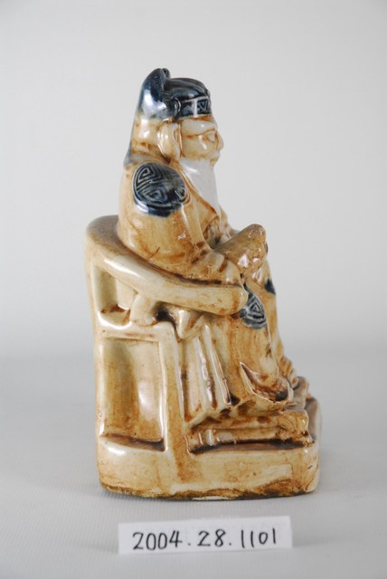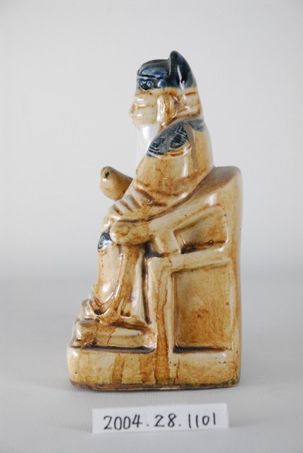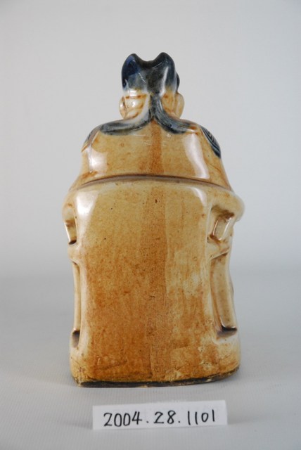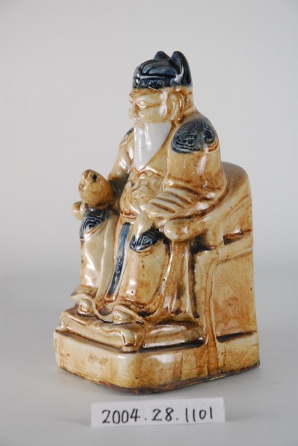 土地公又稱福德正神,部分地區也稱為伯公、后土、社神、土地神等。土地公傳說眾多,一般人生前行善,死後亦有被封為土地公者。土地公不僅掌一境之地,也被視為是文財神。本件土地公為陶瓷燒製,雕刻成頭戴員外帽,身穿朝服的樣式,全身釉彩為土黃偏白,但帽子、肩膝及錦綬部位則為黑藍色壽字紋為裝飾,右手持金元寶,端坐圈椅上。