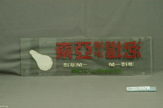 1.本物件為東亞電燈玻璃招牌,材質為玻璃,為長方形玻璃透明招牌,兩面圖案相同,為正反差別,正面右側有白色燈泡圖案,並有「東亞標準燈泡」紅色字樣、「標準第一」、「第一標準」白色字樣及「東亞□□□□□□」綠色字樣,因照片過於模糊而無法辨識。