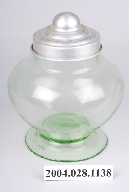 1.此件玻璃糖果罐由草綠色玻璃與銀色鋁製瓶蓋組成。