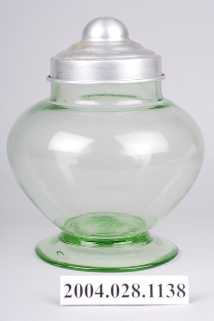 2.玻璃糖果罐是日治至戰後時期常見的民生器具,不管是販賣部或是一般民眾家中均有玻璃糖果罐的蹤跡。玻璃糖果罐通常均有頸短、大口的特色,利於抓取內容物,並採用合金或薄金屬製成的蓋,採直接蓋上密合的方式,方便人們取用。因相較於傳統陶、瓷容器更為輕巧美觀,時常被用於存放餅乾、糖果或醃漬物。