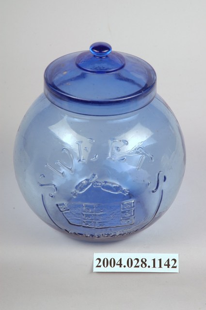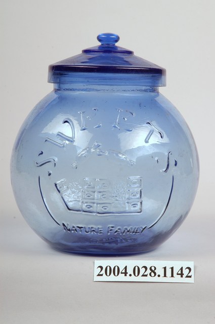 2.玻璃糖果罐是日治至戰後時期常見的民生器具,不管是販賣部或是一般民眾家中均有玻璃糖果罐的蹤跡。玻璃糖果罐通常均有頸短、大口的特色,利於抓取內容物,並採用合金或薄金屬製成的蓋,採直接蓋上密合的方式,方便人們取用。此件糖果罐蓋採與罐身同材質的玻璃製成,且玻璃顏色清透,應是戰後時期製成的。玻璃糖果罐因相較於傳統陶、瓷容器更為輕巧美觀,時常被用於存放餅乾、糖果或醃漬物。