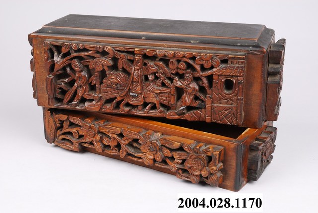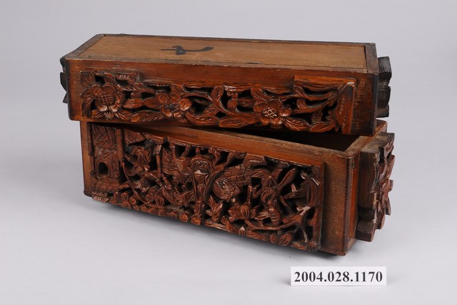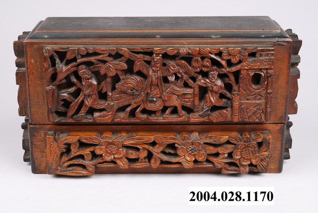 薦盒又稱敬盒、薦臺、奉案或「順盒仔」,為盛放供品的用具承台,一般用來放置酒杯和水杯,以供奉神明。薦盒多以木器、漆器,陶瓷或錫等材質製成,其中以木製品為主,且多有精緻的雕刻。本件為雙層平頭式薦盒,以雙層疊合,內可置酒杯。使用時將上蓋倒放於前,形成上下座,共可放六個酒杯。本件上座前葉刻主僕三人騎馬圖,兩側面為花草圖。下座則前葉及兩側都以陽刻花枝圖裝飾。