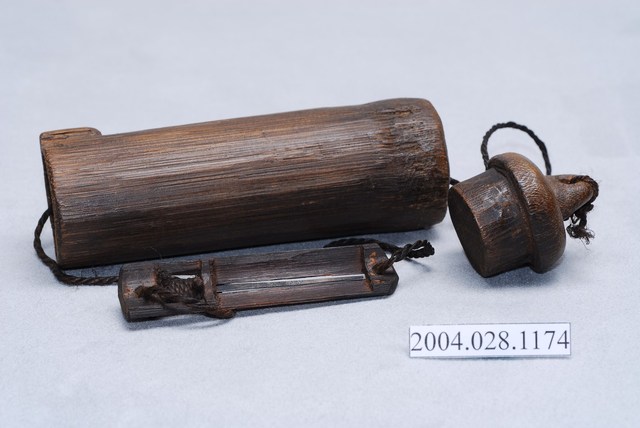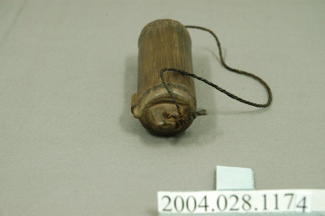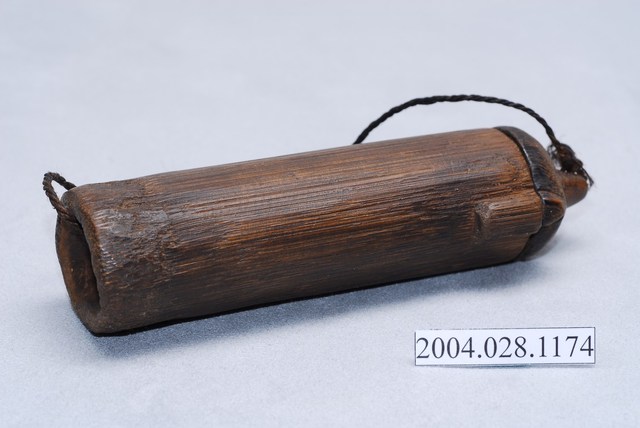 本件藏品為泰雅族口簧琴,係以一片長條形的竹片作為琴臺,中央切刻一條細長凹槽孔洞,置入一片銅製簧片,其中一端進行固定,有些口簧琴則是竹製簧片。此琴臺前後兩端皆有穿孔,靠近簧片固定端為琴頭,繫綁一條麻繩,演奏時須拉動此綁繩。另一端為琴尾,同樣繫有細麻繩,演奏時纏繞手指以固定。另有竹製琴套,可做收納用。口簧琴的簧片可以是一片以上,若簧片越多,琴臺越粗短。在臺灣原住民族中除了雅美/達悟族外,都有此種樂器,但如今已非所有族群皆繼續演奏。泰雅族、太魯閣族及賽德克族則將此樂器更加發揚光大,不僅代表男女互相傳情之意,更