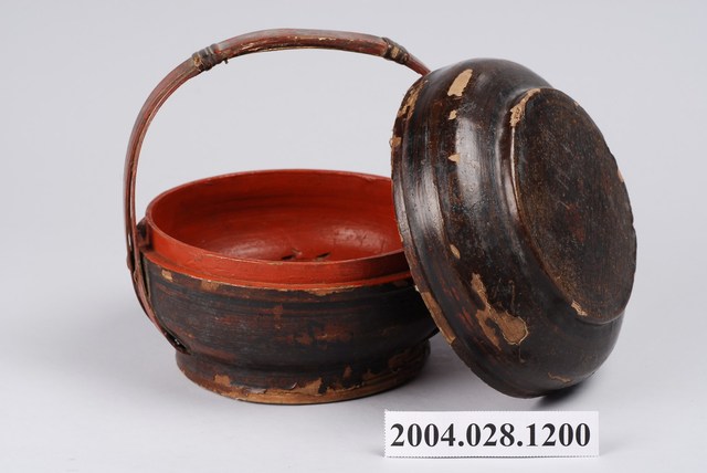 本文物為木製禮籃,圓弧柱狀體,有蓋及提把,用於盛裝物品,咖啡色外觀多處剝落,內部為朱紅色。