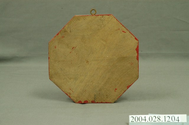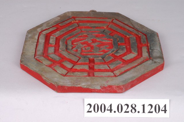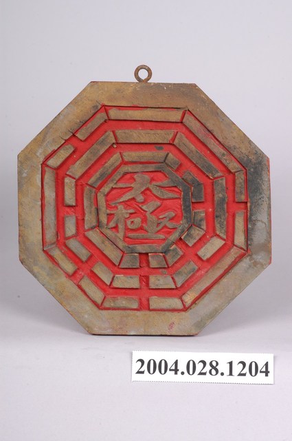 本件太極八卦牌以木雕方式製作,外型作正八邊形,中心鐫刻太極二字,其外圍繞八個卦象,採乾、坤二卦上下相對,為先天八卦排列方式。太極與八卦卦象皆以紅色為底施金漆,但金漆漆面已幾乎脫落,且右半部有薰黑之現象。
