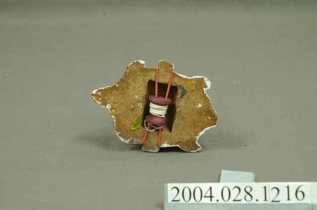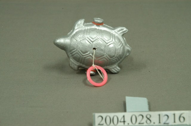本物件為拉線烏龜之玩具,木頭材質。該玩具外觀為銀色之烏龜,龜殼上有一條白色棉線及一個粉紅色拉環,其底部為棕色,可見一條紅色橡皮筋串起一個深紅色的梭子,梭子上可見白色棉線纏繞。