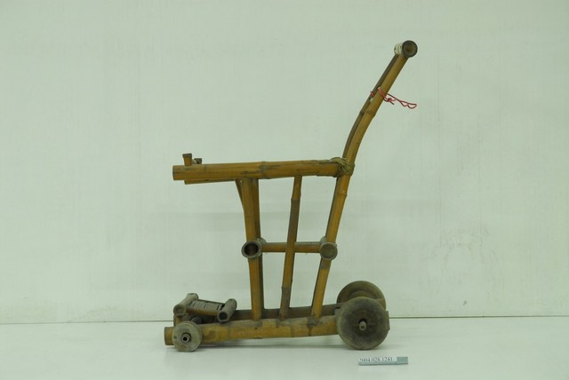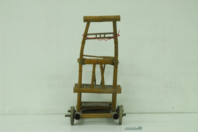 本文物為竹編幼兒推車,有腳踏板的設計,後方椅背加高,方便推行,裝設前面兩個小輪子、後面兩個大輪子,方便移動。早期竹子取得容易,輕巧且舒適的特性,常製作成各式家具使用。