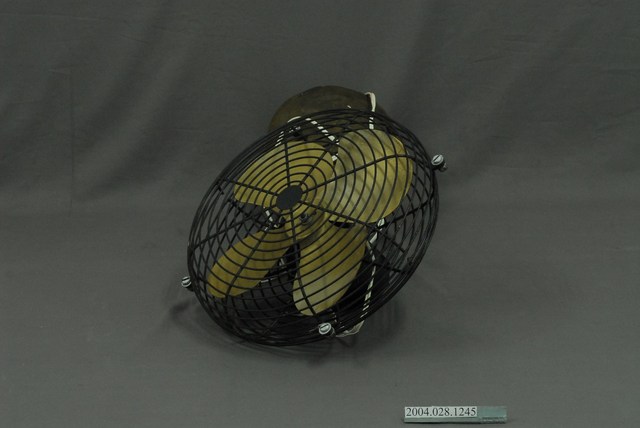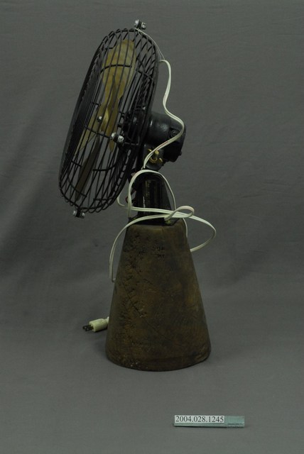 1.本件黑漆壁掛式電風扇,正面為鐵製風罩,呈圓形扁狀,網格由中心圓盤帶有8道放射形骨架,並以同心圓方式層層向外疊加。風罩內帶有四翼鐵製螺旋風扇,表面塗佈黃色漆料,由風扇傳動軸心向後延伸為馬達處。馬達罩下端設計有可調整角度的活動關節,以螺絲蝶帽構造調整。關節以下為電風扇原始底座,為四角形,可用螺絲壁鎖於牆上或天花板。本件電風扇底座另外鎖固於上窄下寬的錐形木柱之上,作立式電風扇使用。2.臺灣電力工程自日本時代開始建設,家庭用電需至二戰結束始普及。電風扇最早於1905年引進臺灣,大部分是民間向電力會社承租電風扇使用,租金與電氣費價格昂貴,故日治時期家用電風扇稀少,電風扇普及率又與都市化程度、官吏人數、日本人比例有關。臺灣於1949年最早由大同公司開始生產電風扇,也從電風扇開始帶動其他家用電器的製造。大同電扇淺綠色和黑色厚實外觀和沈重強力的馬達,一直深受民眾喜愛。