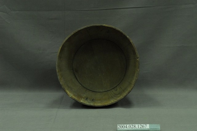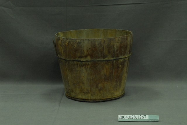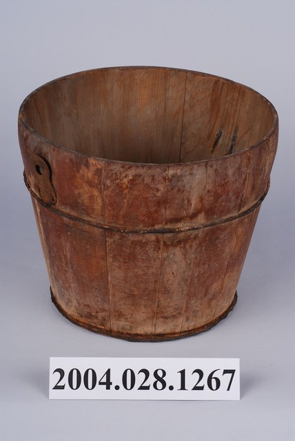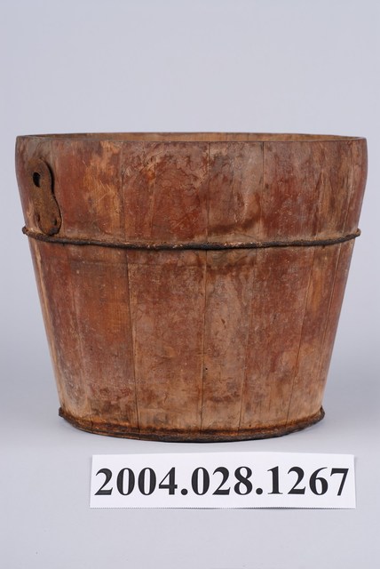1. 木製箍桶,材質主要為木材,以約20片木片拼組而成,木質厚實,器身與器底各有一條鐵絲環繞,作固定木片之用。整體器形為上寬下窄的圓筒狀,圓平底,器腹鐵箍以上至口部微外擴。近口處附有一對耳,耳為鐵製,上有圓孔,推測此是固定提把的五金配件。木桶有許多明顯的使用痕跡,如器身有許多磨損及碰撞擦痕與水漬,鐵箍和鐵製的耳則已都完全氧化生鏽,尤其器底鐵箍有部分鏽蝕已剝落,使鐵箍變的粗細不均。2. 箍桶是指將一片片木片箍束起來所形成的木製盛裝器具。在木片與木片之間以竹釘做榫接,而不以黏著劑或鐵釘接合,避免黏著劑遇水溶解,或鐵釘生鏽脫落,以達到防水效果。桶身則使用纏成麻花狀的鐵絲箍緊加以固定。早期箍桶常以竹篾作箍圈,但較不耐用,後來改以粗鐵線或鋼絲為材。箍桶的用途很多,常見作打水桶、洗臉盆、浴桶,以及炊煮、盛飯用的飯斗。