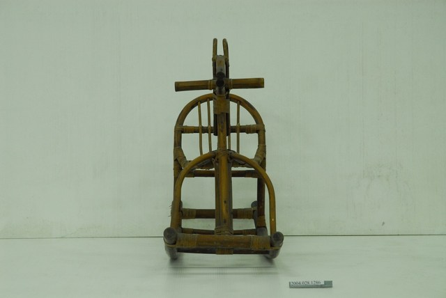 1.本物件為藤製搖擺馬,材質為藤,其主體為一張藤椅,編有靠背,藤椅前方編出馬頭造型,並有握桿,下方則為弧形底座,左右各有一組,並於前端與後端以藤條連接,可供騎乘者前後搖擺。