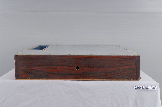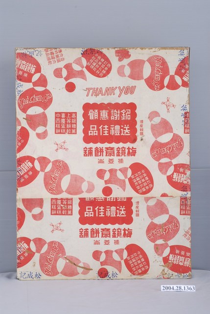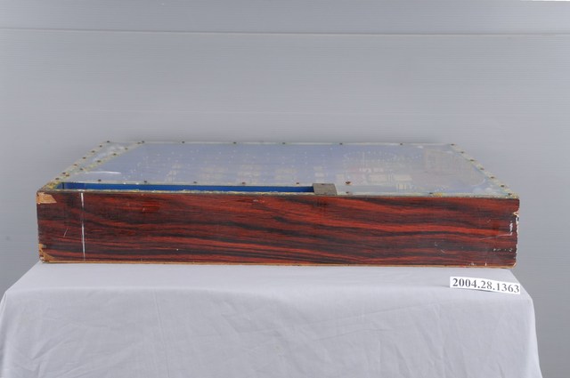 1.本物件為味全手撥式彈珠檯,材質為木頭、塑膠與金屬、紙質,外框樣式為紅色、藍色、黃色組成之花邊,軌道顏色為藍色且上方印有國旗,檯面上方打洞數個作為領獎憑據;彈珠檯背後為梅鏡齋餅舖廣告紙板。