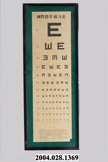 本物件為視力表。視力表為長條型,白底黑字,最頂端印有國際標準視力表,以下是各種不同大小和開口方向的E,左側有0.1-1.0、1.2、1.5的數字,每個數字旁都有相對應大小的一列E,數字用於判定視力情況,例如近視程度。