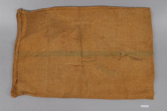 本件麻布袋係以麻類植物纖維製成細線後,再編織成布片縫製而成,以單幅麻布片採短邊疊合對折後,以短邊作開口,於2側長邊緊密縫合完成,開口處另外向外折起作緄邊處理,呈長75.6公分,寬107.7公分,高4公分之直式長方形袋。外觀呈現麻纖維之原色,即為黃褐色。麻布袋雙面中段處皆有1道垂直綠色寬線印刷於表面,其中一面以藍漆印上「官農」字樣,另一面則帶有紅色與藍色之戳章。麻布袋為傳統裝盛用具,實用性高且用途廣泛,主要用來裝盛各類貨物方便堆疊運輸。
