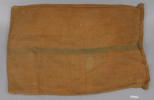 本件麻布袋係以麻類植物纖維製成細線後,再編織成布片縫製而成,以單幅麻布片採短邊疊合對折後,以短邊作開口,於2側長邊緊密縫合完成,開口處另外向外折起作緄邊處理,呈長75.6公分,寬107.7公分,高4公分之直式長方形袋。外觀呈現麻纖維之原色,即為黃褐色。麻布袋雙面中段處皆有1道垂直綠色寬線印刷於表面,其中一面以紅色戳印上「4832」數字號碼。麻布袋為傳統裝盛用具,實用性高且用途廣泛,主要用來裝盛各類貨物方便堆疊運輸。
