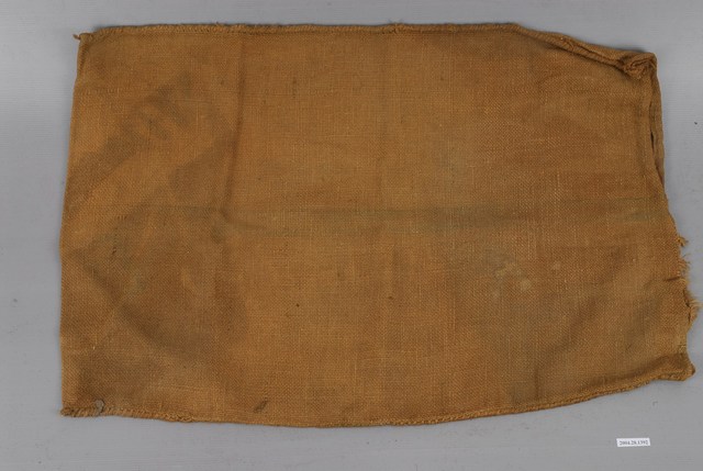 本件麻布袋係以麻類植物纖維製成細線後,再編織成布片縫製而成,以單幅麻布片採短邊疊合對折後,以短邊作開口,於2側長邊緊密縫合完成,開口處另外向外折起作緄邊處理,呈長74.2公分,寬114.1公分,高4.2公分之直式長方形袋。外觀呈現麻纖維之原色,即為黃褐色。麻布袋雙面中段處皆有1道垂直綠色寬線印刷於表面,現已略為褪色。麻布袋為傳統裝盛用具,實用性高且用途廣泛,主要用來裝盛各類貨物方便堆疊運輸。