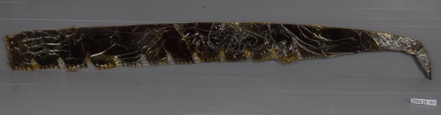 本文物為五齒鉤鋸,又名五齒孔鋸、五齒空鋸,為日本時代1930年由日本引入的伐木用鋸,於砍樹、造材的橫截樹材作業時使用。伐木鋸基本特徵為鋸片後端作成鐵條插入木柄,鋸片與木柄呈人字形。本件無木柄。五齒鉤是以鋸齒為五齒及一深鋸溝為一組,連續排列而成,五齒分成四切割齒及一刮鉋齒,深鋸溝可收集木屑,利於橫向截切樹材。鋸齒規格有三尺到七尺。砍樹時先在預計倒下的樹側以斧鑿劍口,再於對側以五齒鉤鋸鋸到樹倒。樹倒後進行造材作業,以五齒鉤鋸將樹材截切成適當的長度。