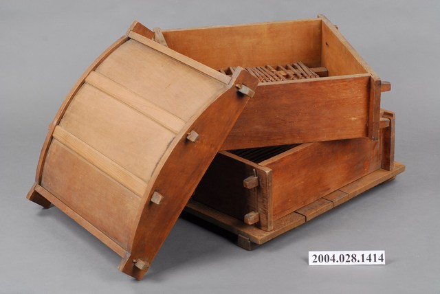 1.方形圓頂木蒸籠組,共1組4件,包括頂蓋1件、中層籠身2件,底板1件。整體呈四角方體圓頂狀,頂蓋與兩層籠身皆以木材接榫製成,材質厚重,承重力佳。蒸籠也叫籠床,上蓋部分可與籠身接合,以減少蒸氣外洩,下方二層籠身的層底有長條竹編成的大孔隙底板,用來放置食物。使用時將蒸籠放置在承水的大鍋上,當鍋內的水煮開後,蒸氣會上升穿過底板的孔隙將食物蒸熟。