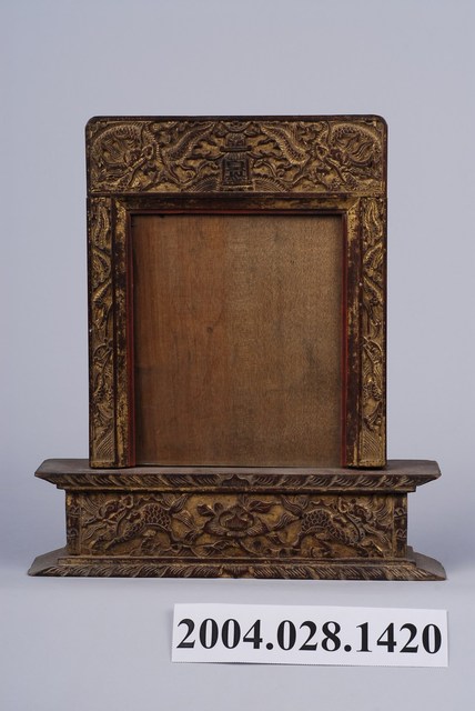 本件為公媽龕,長方形木板製作,外框上方雕刻雙龍搶塔,塔內刻「皇恩」,左右外框刻降龍紋。底座刻兩隻麒麟回首紋。書寫姓名的牌位已遺失。臺灣公媽牌造型主要有神龕式和立碑式兩種,本件為後者。