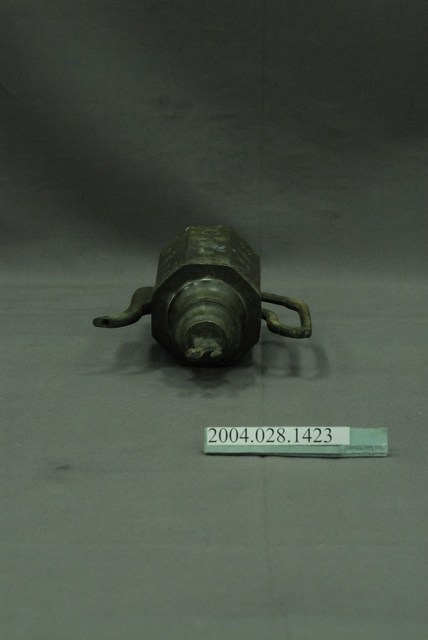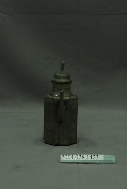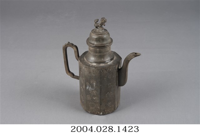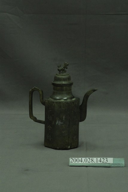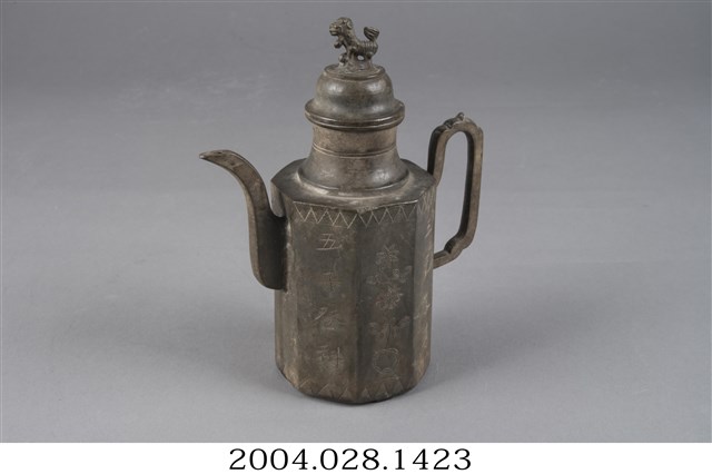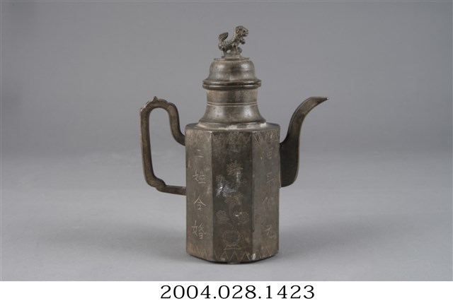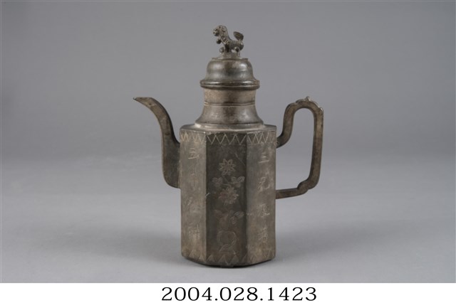 1.獅鈕花卉紋八角錫壺可分為壺蓋與壺身2部件,通身以錫金屬製作,表面呈暗灰色。蓋身為上窄下寬樣式,其蓋頂半圓形凸起,蓋緣向外略微折沿,作虛壓蓋形式。頂面中心處作獅形鈕。壺身呈口部作圓唇,頸部中段束頸,帶有兩道弦紋裝飾,器身呈八角形長筒狀。流身與器身交界處有明顯分界為明嘴樣式,流身則依照彎曲的次數為樣式名稱,本件流身為三彎嘴式,其流嘴呈舌口形,於流嘴相對處之器身一側,作C形上翹環形手把。器身6面刻有二姓合婚、三元及第、五子登科、百年偕老,與2面花葉紋。為新婚場合使用之器具,