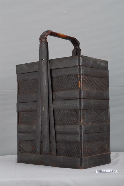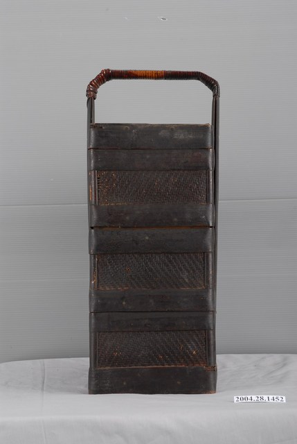 1.三層長方竹製提籃,長方形隔盒式造型結構,兩側有提樑式把手固定於長側邊底層,上有淺蓋,通體以竹篾、竹條與木板拼接製成。竹篾為盒身外側邊壁部分、竹條為各盒層的上下邊框、轉角邊的欄條與提把部分,木板拼接為盒身內側邊壁與底層部分;盒層的邊框與提樑底部有打釘加固;竹篾與竹條皆塗以黑色漆。因年代久遠,漆面有龜裂與脫落,竹條則部分破裂的狀況。盒身內部的木板拼接以及竹篾密編的構造,主要為使達到保溫效果。