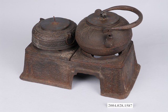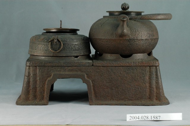 長火缽用溫酒煮水鑄鐵茶具組可分為鐵壺、鐵釜與雙口爐架共3部件,皆以鑄鐵製作成形。主要搭配長方形箱狀的火缽一同使用,可作的煮水器以及溫酒器使用,雙口爐架可放置鐵壺與鐵釜,底緣長邊一側作ㄇ形開口,內部可放置木炭作加熱熱源,加熱煮水以鐵壺為主,一旁的鐵釜為儲放加熱的水,透過木炭的餘熱讓鐵釜的水保溫,可避免將冷卻。鐵釜內可放置溫酒用的金屬杯或瓶。
